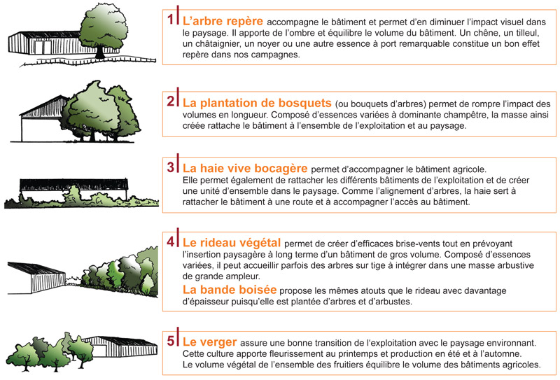 Un accompagnement paysager permet d’adoucir les lignes brutales dans le paysage et l’environnement de l’exploitation. Des opérations au coup par coup sont à proscrire. Une approche plus globale est nécessaire pour que le projet intègre le fonctionnement de l’exploitation, son évolution et le contexte paysager. Chaque forme végétale jouera un rôle particulier dans le projet d’aménagement.