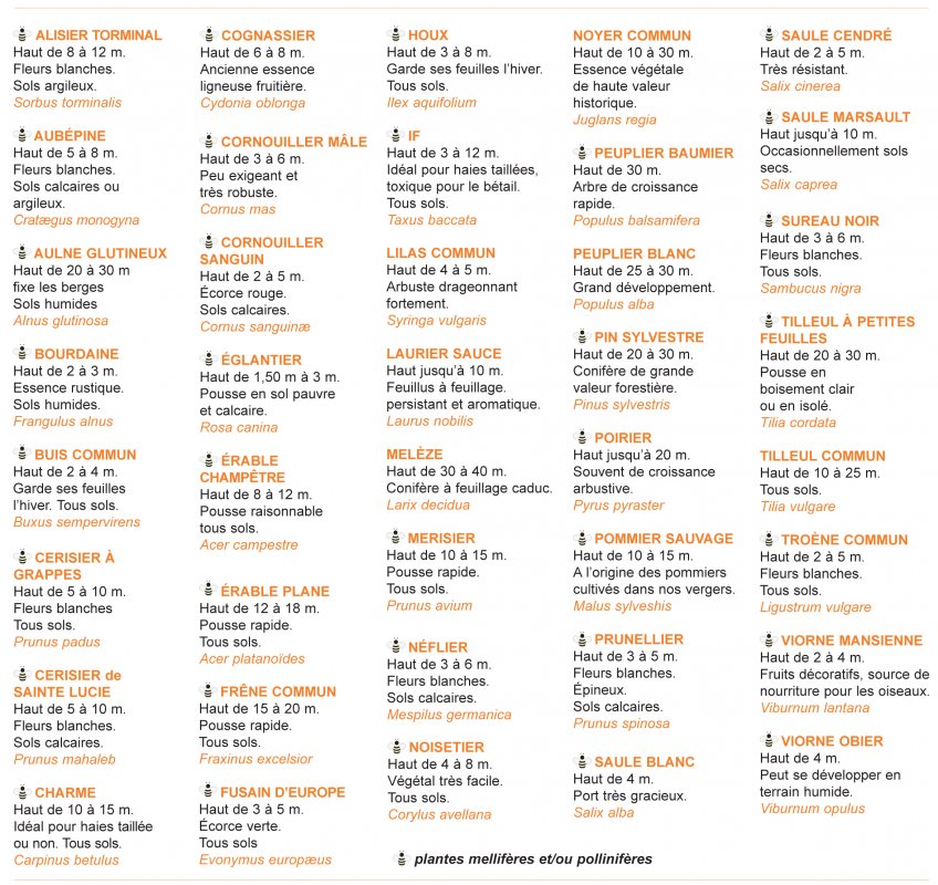 Les conifères tels que les thuyas (Thuya), les faux-cyprès (Chamæcyparis), les ‘Leylandi’ (x Cupressocyparis leylandi), les cyprès (Cupressus)… de même que les lauriers-cerises (Prunus laurocerasus), les peupliers d’Italie (Populus nigra ‘Italica’) sont à proscrire.