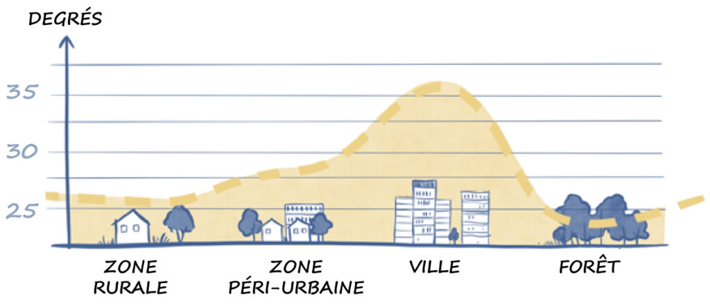 Les étés caniculaires ont un fort impact sur la qualité de vie en ville. En effet, l’imperméabilisation des sols, la concentration de véhicules thermiques et l’agglomération de constructions minérales sont les facteurs principaux de la création d’îlots de chaleur urbains (ICU). En été, on peut observer jusqu’à 10 degrés d’écart de température entre les zones urbaines et rurales. Le rafraîchissement urbain est donc un enjeu majeur pour les villes et villages de demain