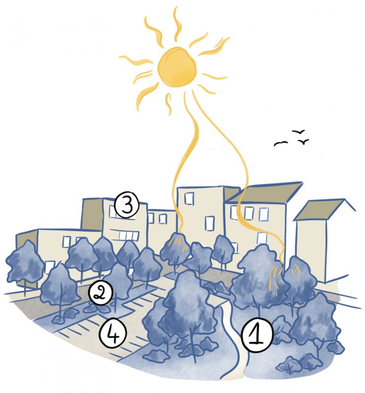 1 – La végétation varie en densité et diversité, des fosses de plantations communes sont aménagées, favorisant le développement racinaire et la biodiversité en ville. Les ombres portées des arbres assurent des espaces plus frais. Le mécanisme d’évapotranspiration des feuilles des arbres rejette de la vapeur d’eau et rafraîchit l’air ambiant.