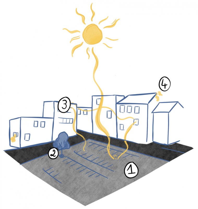 1 – Le sol minéral imperméable de couleur sombre favorise une forte inertie thermique. Les matériaux de couleur sombre piègent la chaleur lors de la journée et la redistribuent dans la nuit. Les eaux de ruissellement ne peuvent pas s’infiltrer dans le sol et sont rejetées dans le réseau.