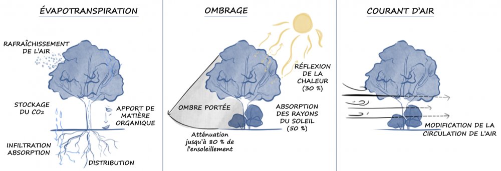 Le rafraîchissement induit par les arbres dépend de nombreux facteurs : le nombre d’arbres plantés, la couverture foliaire, la densité de leur feuillage, les essences, la qualité du sol