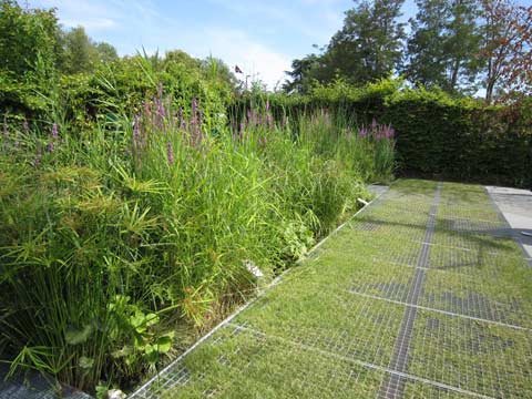 – Toitures des bâtiments publics et habitations : comparée à une toiture traditionnelle, une toiture avec un couvert végétal retient une proportion plus importante d’eau de pluie. Cette végétalisation provoque un retard à l’évacuation des eaux excédentaires dans les réseaux collectifs en cas d’orages ou d’averses brutales. Cet aspect est peu significatif à l’échelle d’un bâtiment isolé ; il est plus intéressant à l’échelle d’un quartier pour réduire le risque de saturation des réseaux d’assainissement en cas d’orage violent.
