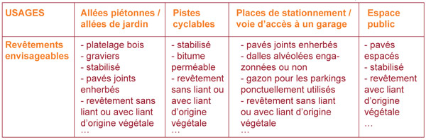 Des termes comme surfaces absorbantes, surfaces perméables ou semi-perméables sont de plus en plus employés dans les recommandations et règlements d’urbanisme.