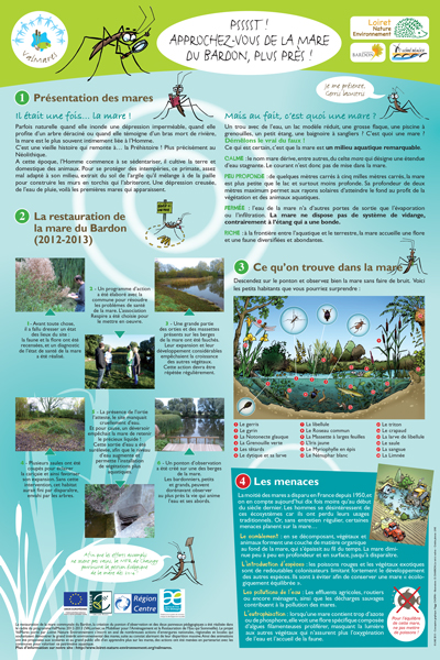 Extrait : « Depuis 1950, 50 % des mares ont disparu en France. Les études Trames Vertes et Bleues réalisées en Loir-et-Cher ont confirmé la fragilité de ces habitats. Pour mener à bien le maintien et le renforcement du réseau écologique des mares, des connaissances sont nécessaires à l’établissement d’un diagnostic. Ainsi, il a été choisi de mettre en place un outil d’aide à la décision dans l’aménagement du territoire : un observatoire des mares. »