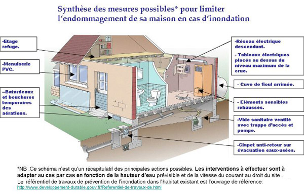 Le référentiel de travaux de prévention du risque d’inondation dans l’habitat existant (déclinable aussi pour les nouveaux projets), réalisé par le ministère de l’Égalité des Territoires et du Logement et le ministère de l’Écologie, du Développement durable et de l’Énergie est destiné aux professionnels intervenant sur le bâti situé en zone inondable.Il distingue notamment les travaux à effectuer selon le type d’inondation.
